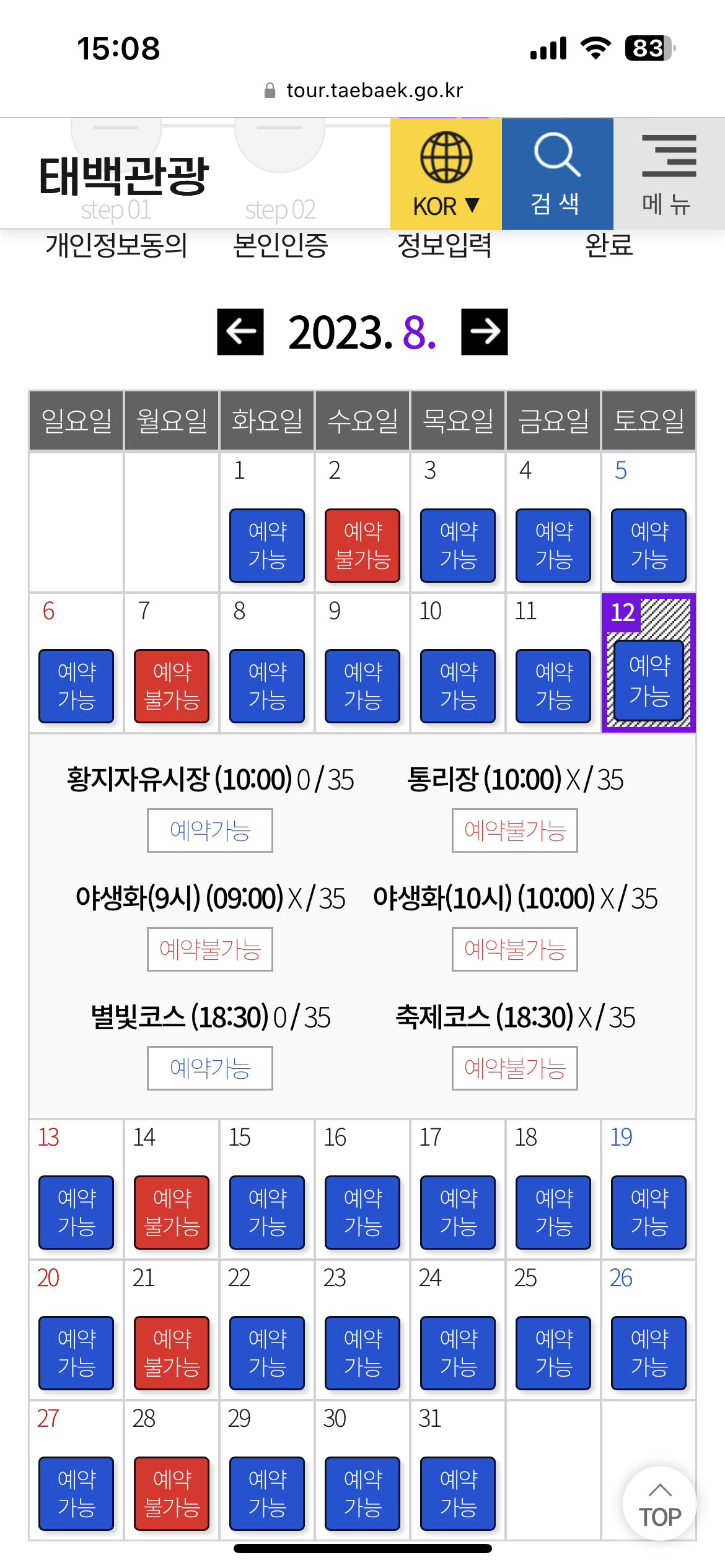 축제코스 날짜엔 별빛코스 예약이 활성화되어있고