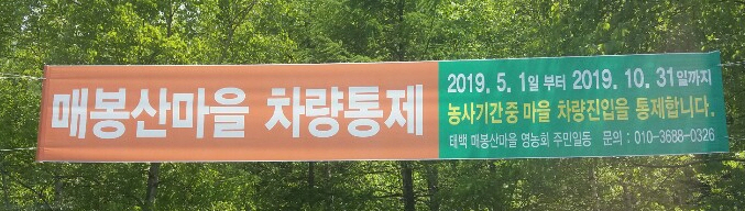 1. 농번기 인 2019년 5월1일~ 2019년 10월 31일 까지 차량진입을 통제합니다.