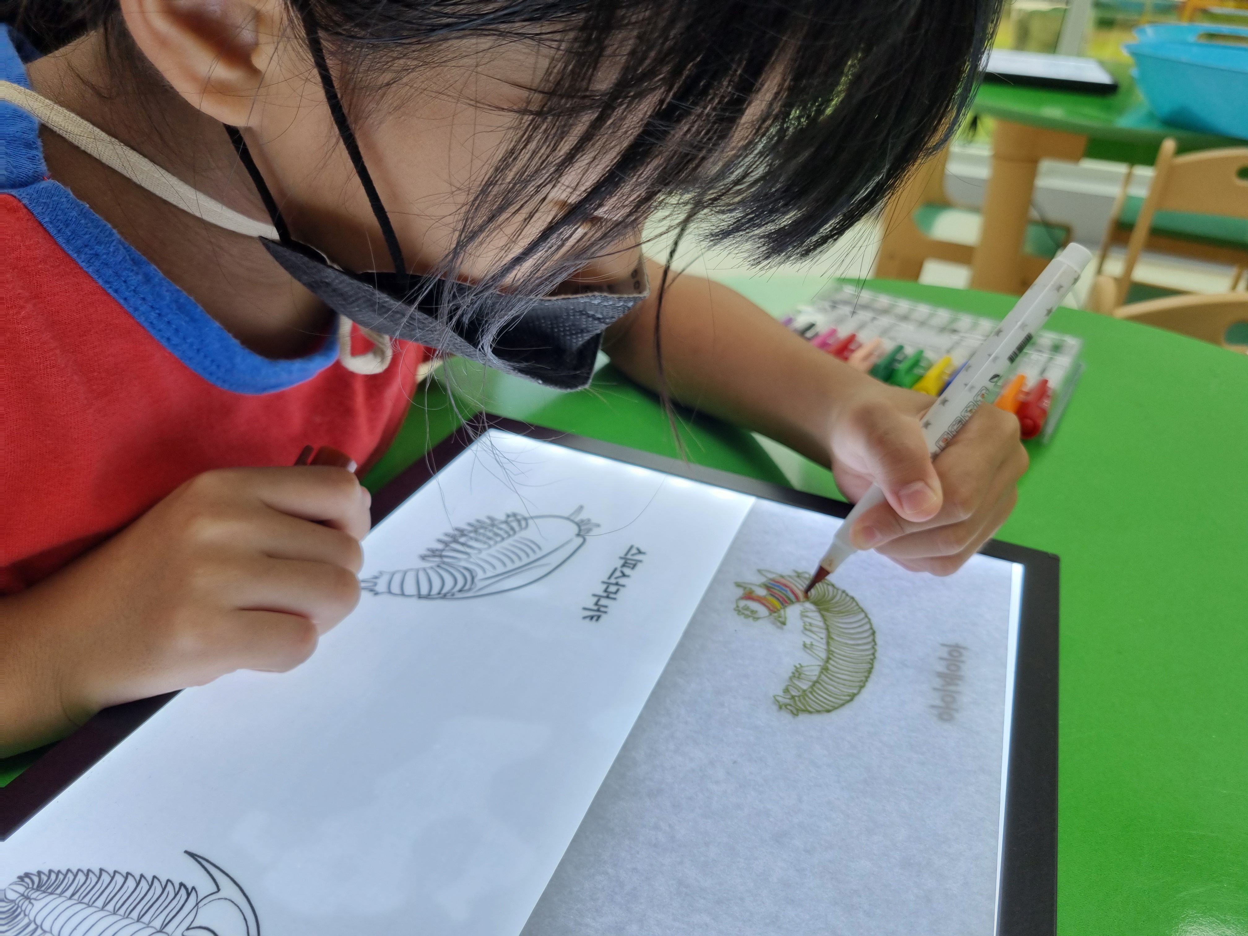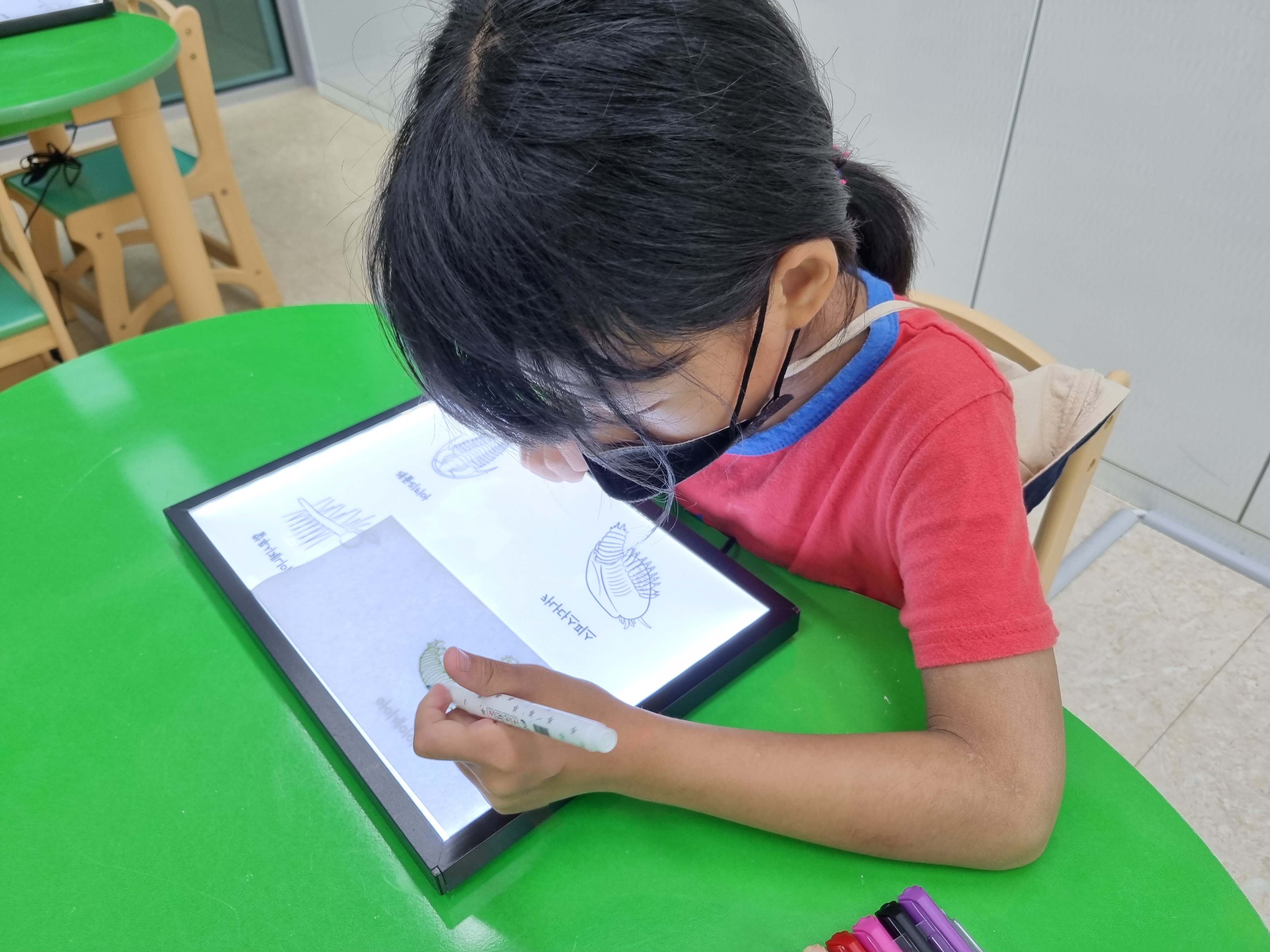 개관하고 얼마지나지 않아 입장한 귀여운 자매들이 [고생물 친구들]의 고생물 그리기에 열중하는 모습이