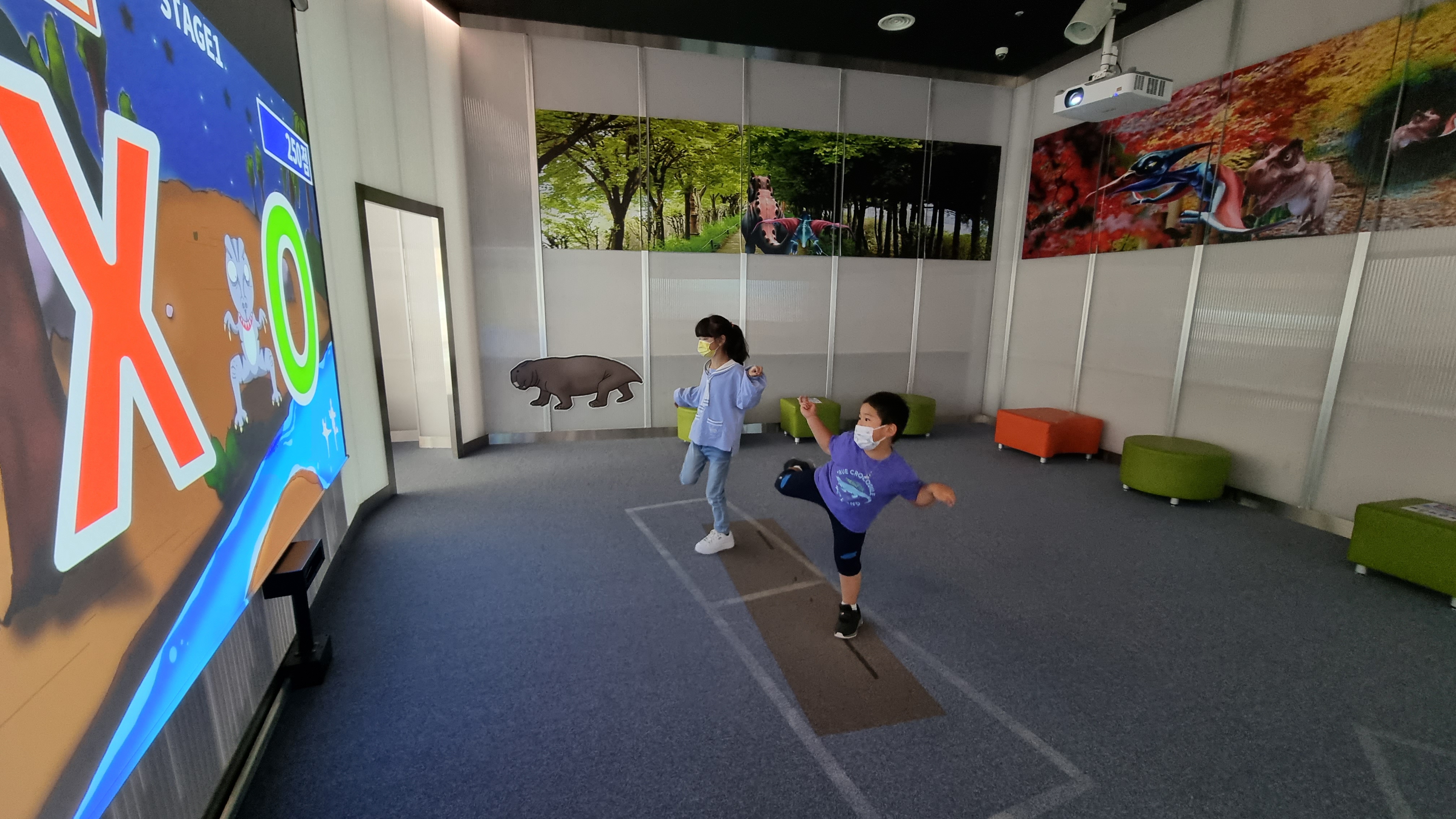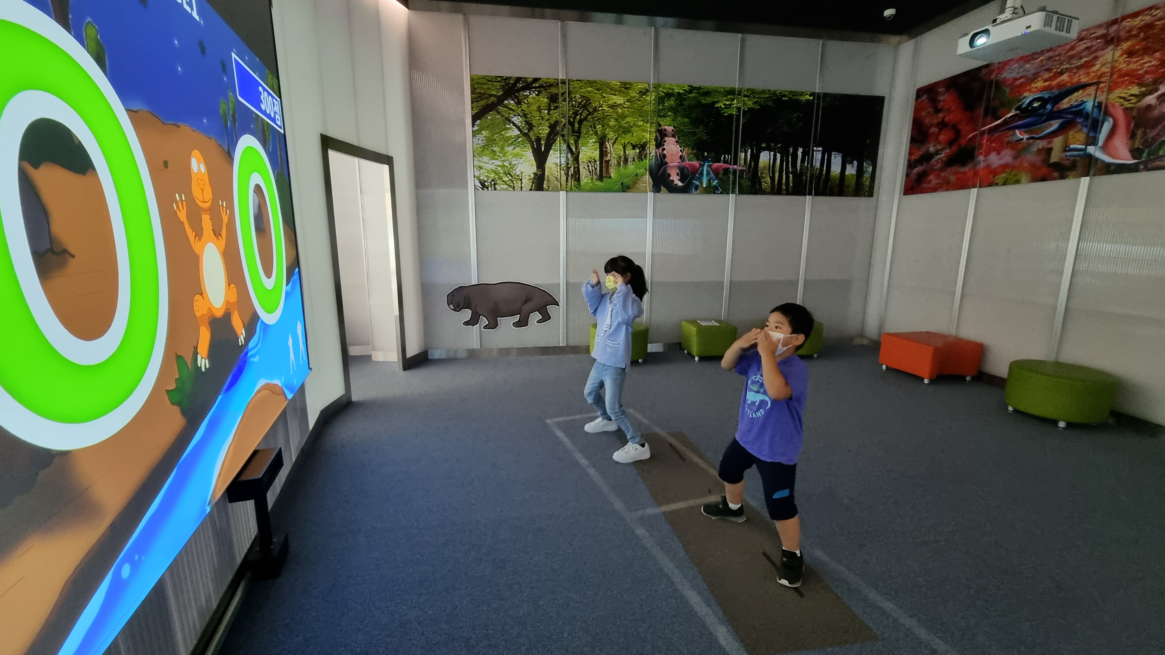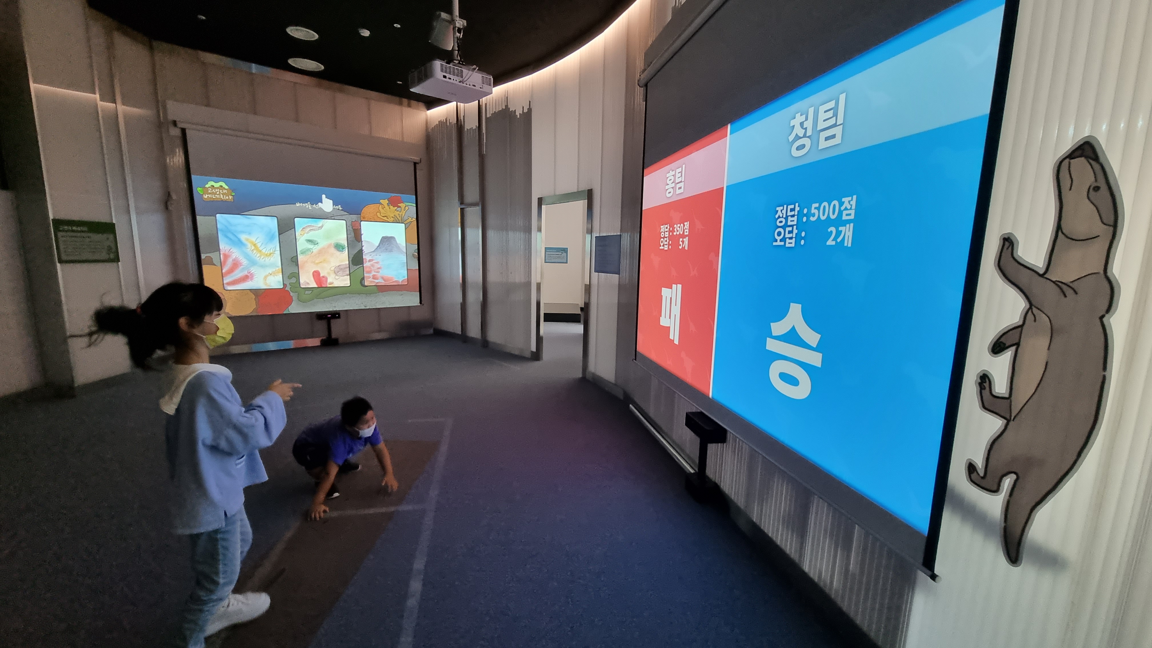 박물관 입구에서 좌측에 위치하고 있는 콘텐츠체험관은 고생물을 출현시켜 몸으로 체험하는 체험공간입니다. 공룡레이싱, 구문소를 넘어라 등 4개의 체험거리로 구성되어 있는데요,