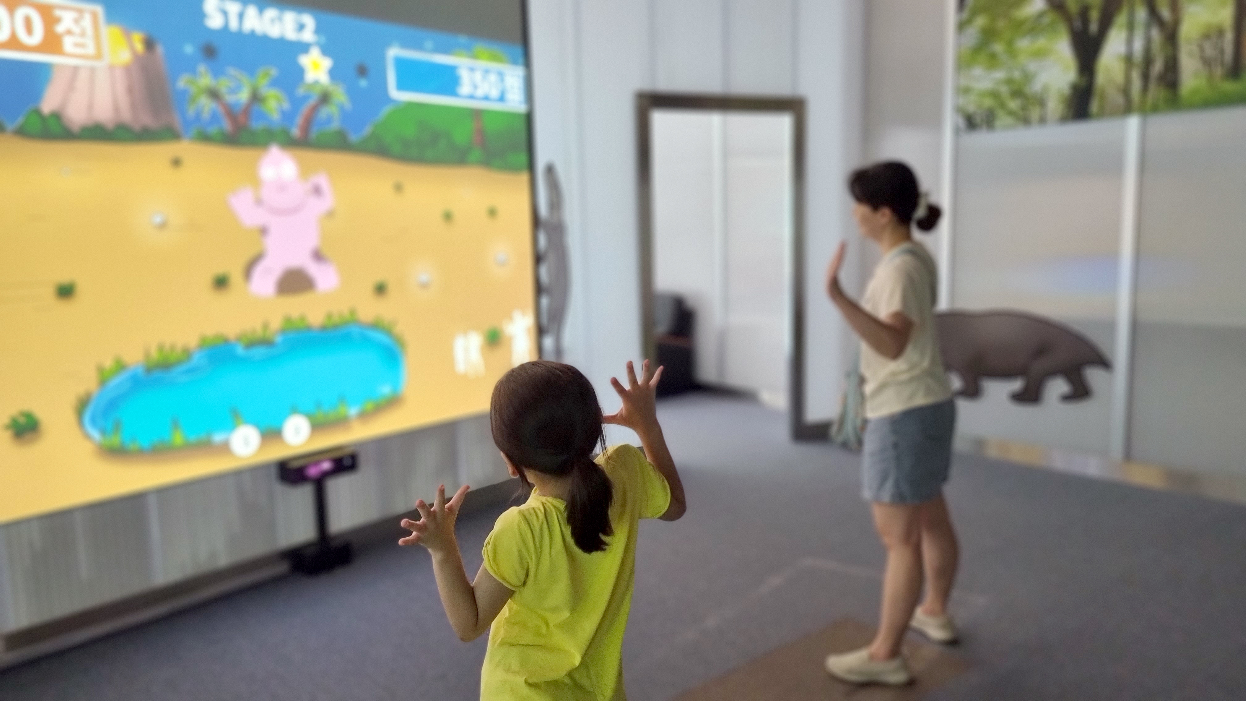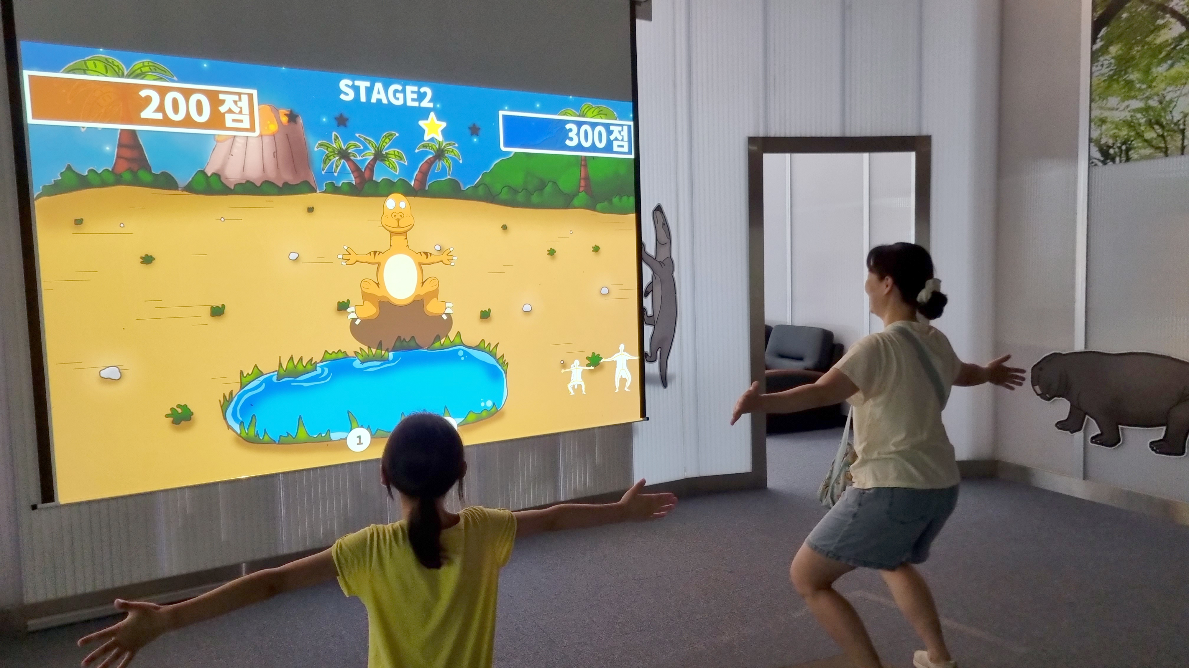 저희 박물관 입구에 들어서면 좌우측으로 소규모 체험과 참여공간이 마련되어 있고, 좌측에는 [콘텐츠체험관]으로 참여자를 인식하여 몸으로 체험하는 여러 종류의 시설이 반겨줍니다.