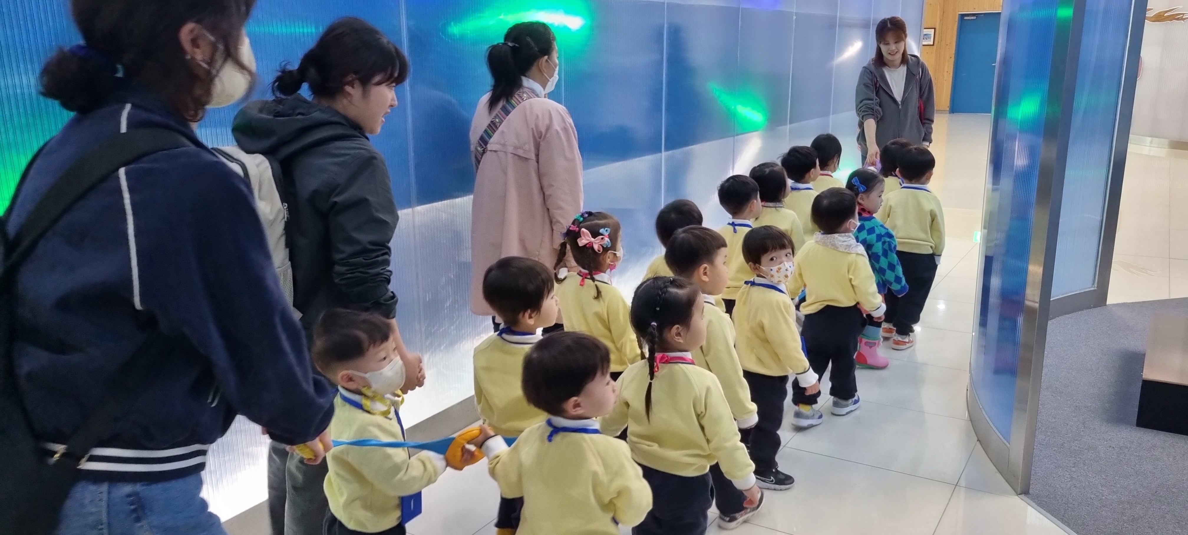 옷의 색이 봄날의 개나리꽃처럼 상큼한 어린이들이 이른 아침에 박물관을 방문하였습니다.