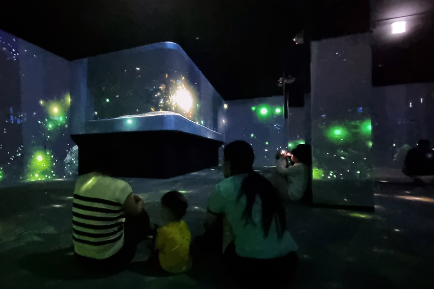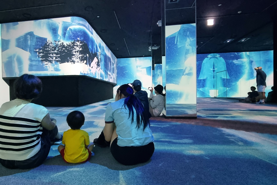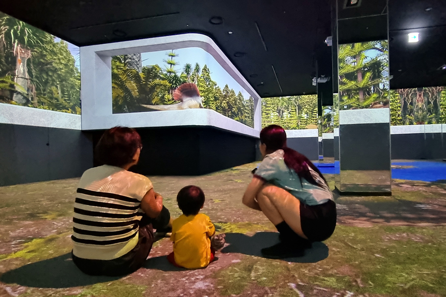 저희 박물관 3층 기획전시실에는 실감영상 기법으로 후기 고생대 생활상을 구현하여 상영하고 있습니다. 아직 완벽한 모습은 아니지만 그래도 즐겁게 관람하시는 모습에서 즐거움을 느낍니다. 저희 박물관에서 즐겁고 유익한 추억 많이 쌓아 가시길 바랍니다.