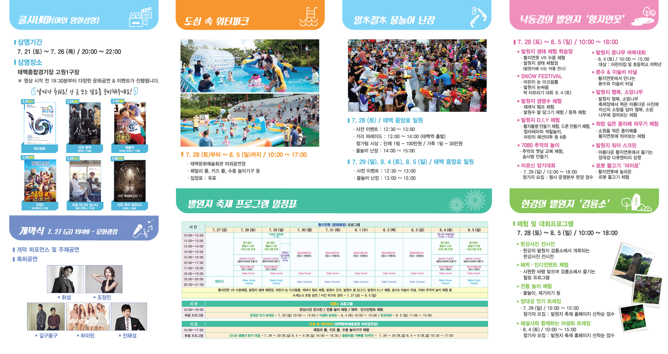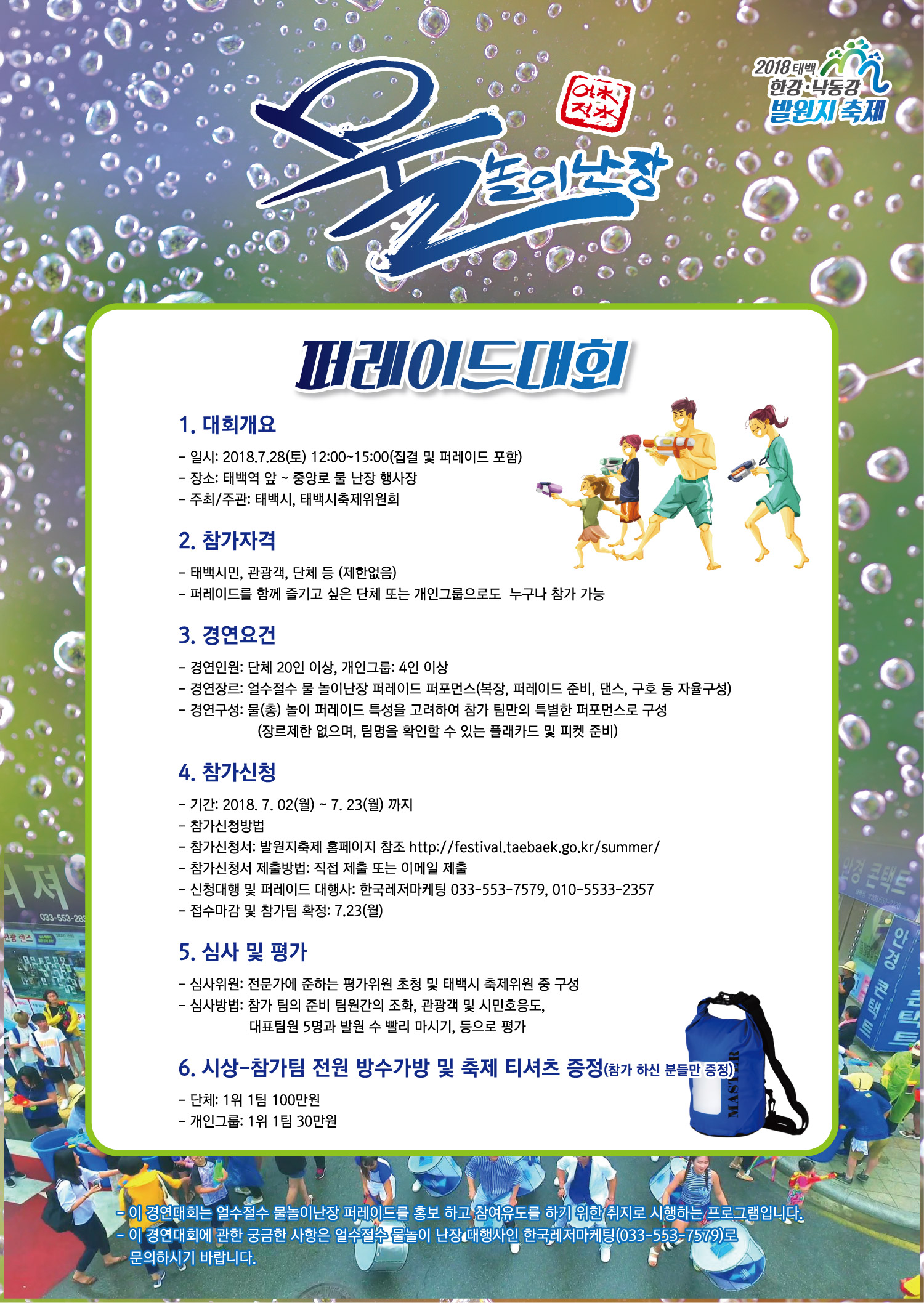아울러 2018. 7. 28.(토) 개최되는 얼수절수 워터페레이드 경연대회에 많은 참여 바라며, 축제기간 중 태백고생대자연사박물관에도 많은 관람 부탁드립니다.