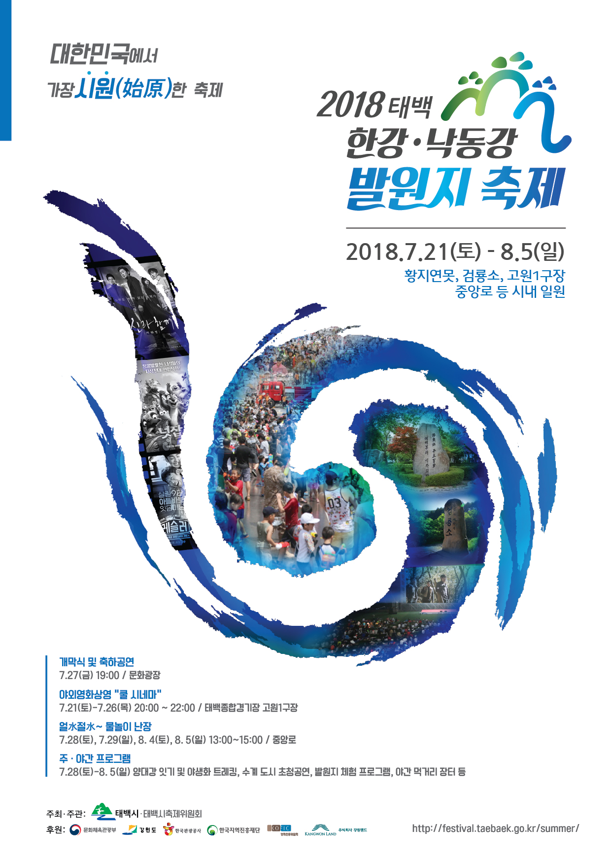 대한민국에서 가장 시원(始原)한 축제!『제3회 태백 한강?낙동강 발원지 축제』가 2018. 7. 21.(금) ~ 8. 5.(일)까지 16일간 황지연못을 비롯하여 검룡소, 고원1구장 등
