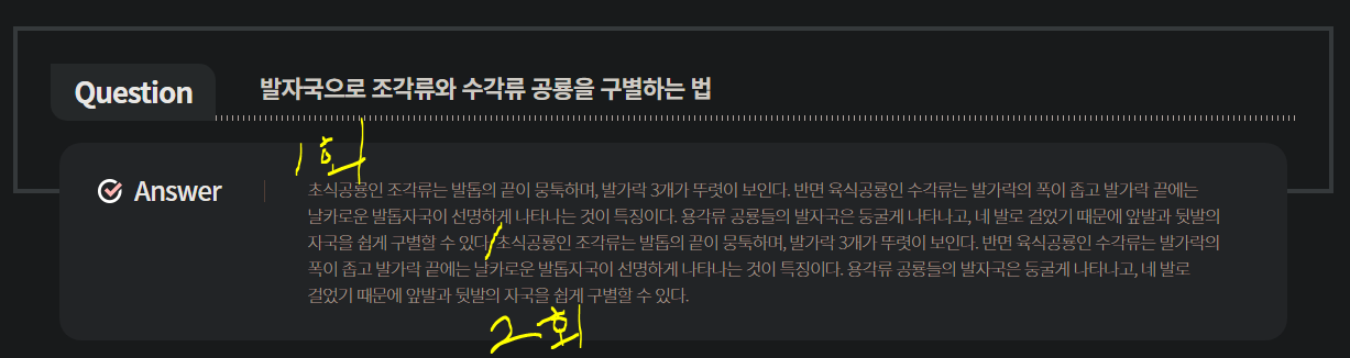 'Question 발자국으로 조각류와 수각류 공룡을 구별하는 법' 의 대한 답변이 같은 문단으로 2번 반복되어 있습니다.